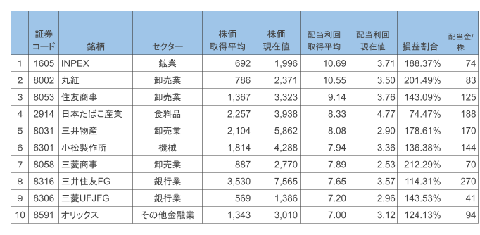 今期の増配を受けて取得平均の配当利回りが10%を超えた銘柄が